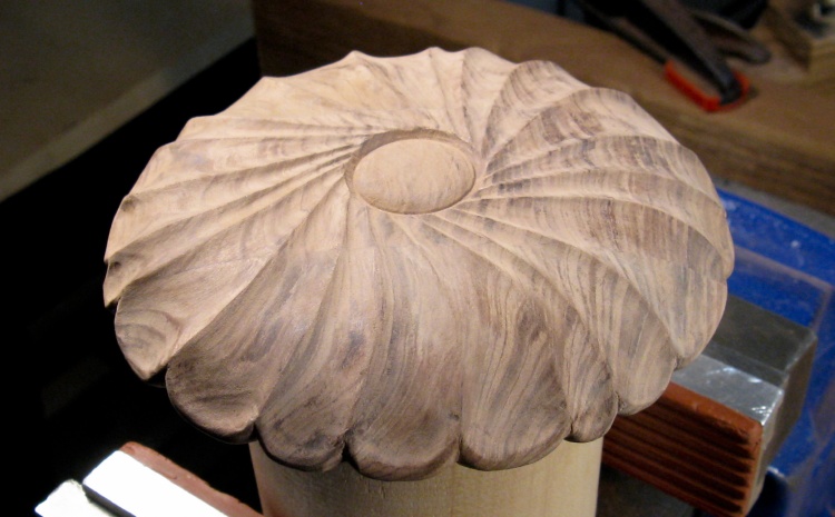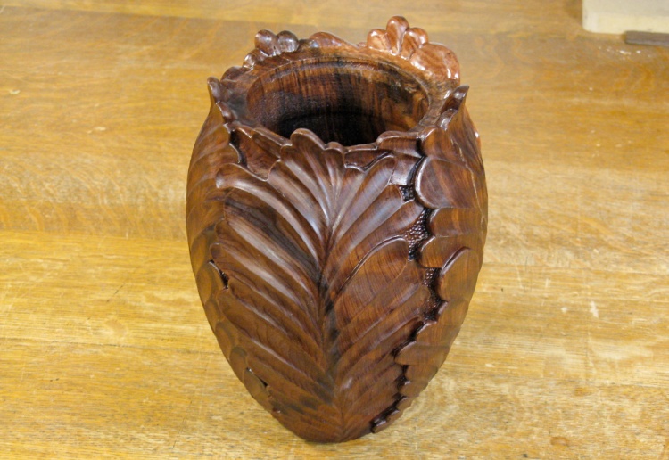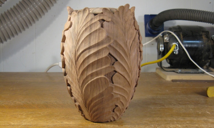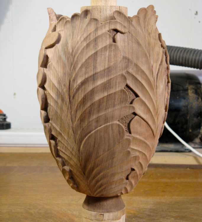 And that was it for most of the outside woodworking. This shot shows the urn after the outside and top leaves have been completed.