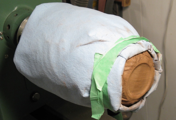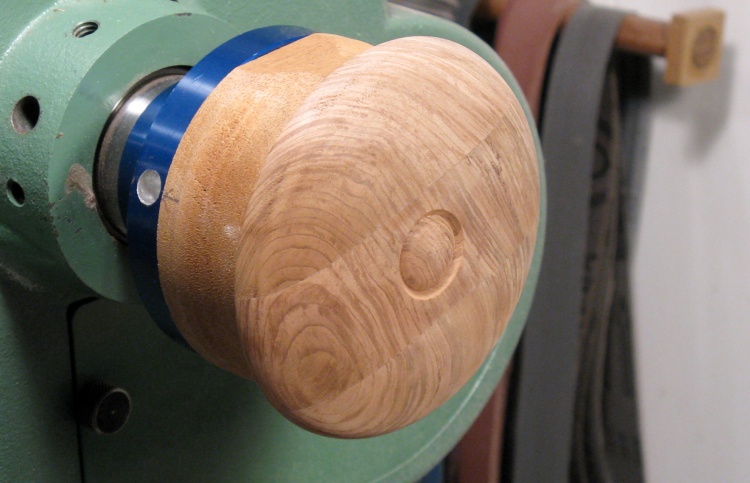 As expected, the bottom wasn't perfectly centered with this ad-hoc mounting so wood removal was done at low speed using a grinder followed by sanding to eventually produce the shape seen here.
