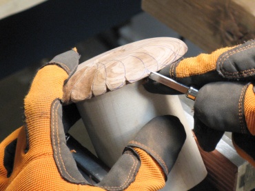 I cut a recessed circular section on the bottom of the cover to fit the urn liner lid and then flipped it over to this orientation and shaped the profile, including a domed central button.