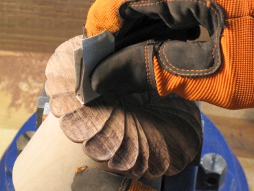 Then the edges of the guide slots were connected with smooth curves using a wide scraper. Here I'm almost down to the slot bottoms on the lower half of the urn (and no, the curves don't qualify as "smooth" yet).