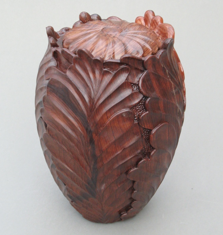 A relation of mine whose funeral planning included cremation had asked if I would make a wooden funeral urn. We looked at various ideas and ultimately settled on this fern-motif design which is based on the work of Ron Fleming; an expert wood turner and carver from Oklahoma. He has an extensive and varied body of work which includes several vessels based on this stylized fern design.