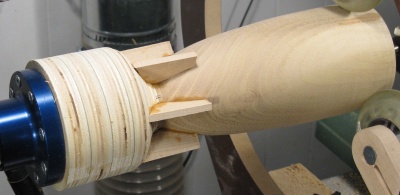 The vessel needed to be flipped end-for-end on the lathe so to hold the top, I cut a circle into a piece of MDF on the faceplate. This formed a jam chuck into which the top of the vessel would fit tightly. That allowed the lathe to spin the vessel without damaging the top.