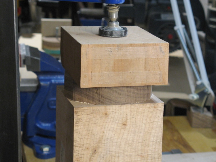 To make space for them I glued a walnut disc onto one end. The square block on top in this photo is just to distribute clamp pressure.