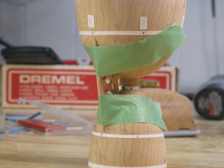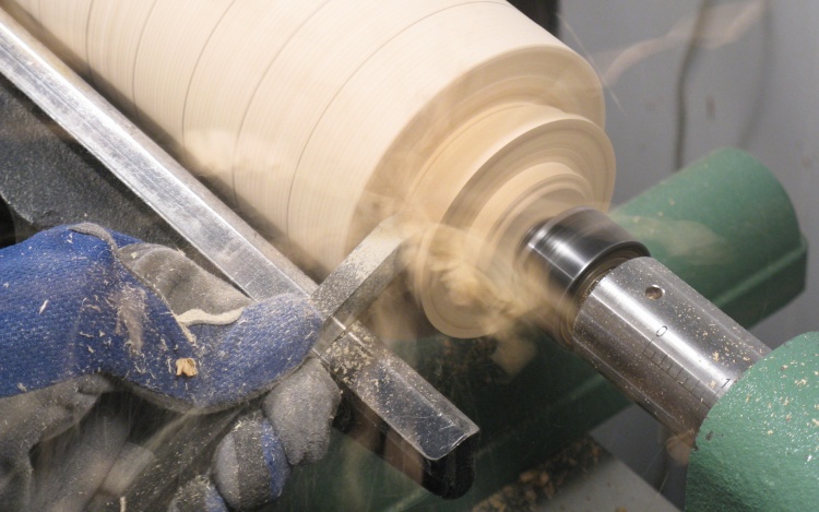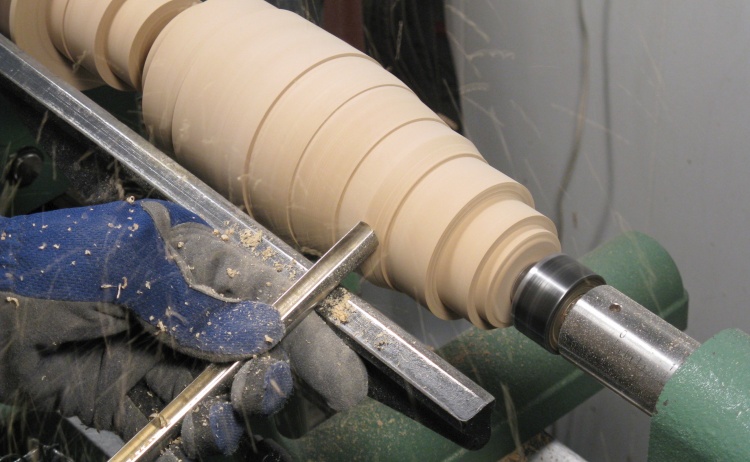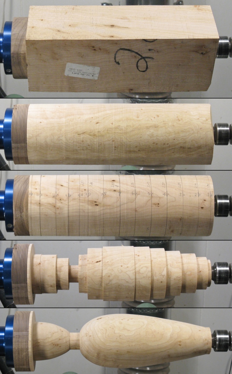 Once the block had reached a state of cyllinderness (cyllindricality?), I pencilled guide lines at one-inch intervals along the length and then started to cut the sections to the proper diameters as shown here.