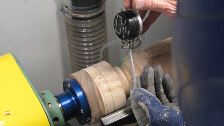 Here I'm measuring one of the diameters with a set of digital calipers before taking the next little bit off.
