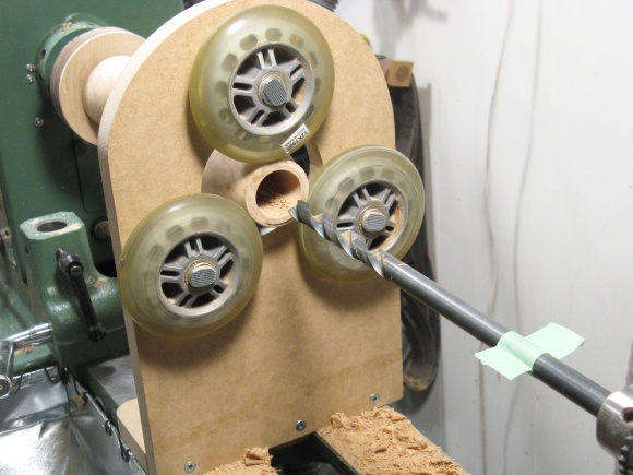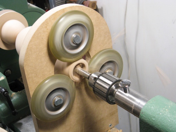 Then it was time to start the hollowing. I set up the steady rest and placed its wheels to run on that extra little bit at the top.