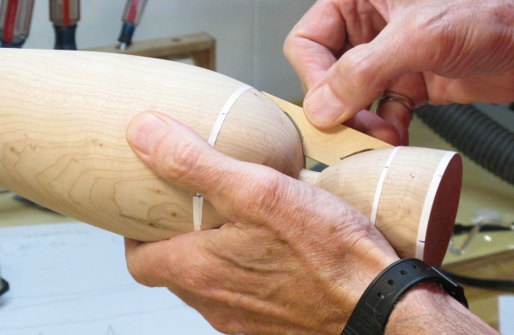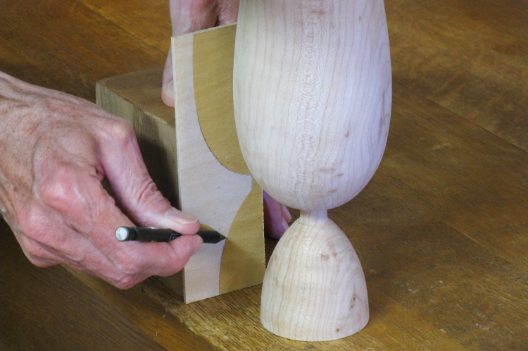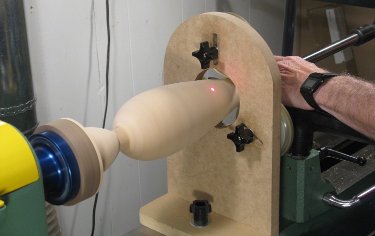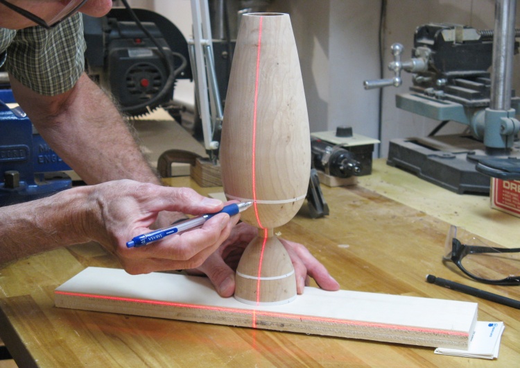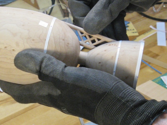 I wanted a pattern for the girders so I needed an accurate profile of the turned vessel. To do that I projected a focussed beam from an LED flashlight past the side and traced the shadow onto a 1/8"-thick piece of plywood using a pencil.