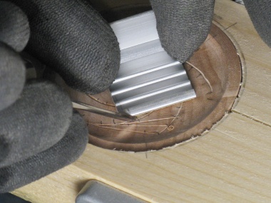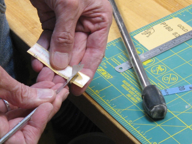 In this photo I'm removing some tape liner on a piece of sandpaper that will be stuck to the rounded sanding tool on the bench.