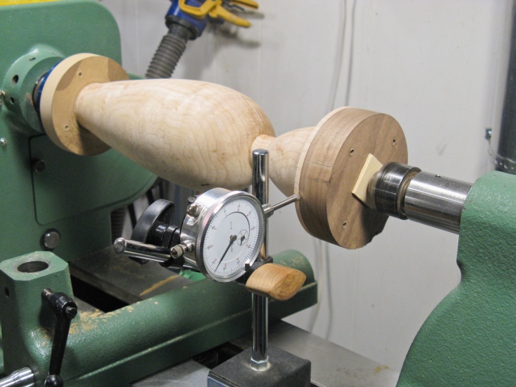 Then when centering is as good as it will get, the tailstock is extended further to drive the live center point through the wafer and into the bottom of the vessel to mark the center. Then I loosened the tailstock, discarded the wafer and tightened it back up with the live center in the newly-marked hole. I was able to get to within about 0.006" with this technique which is close enough to be able to sand out any artifacts caused by re-turning the slightly eccentric vessel.