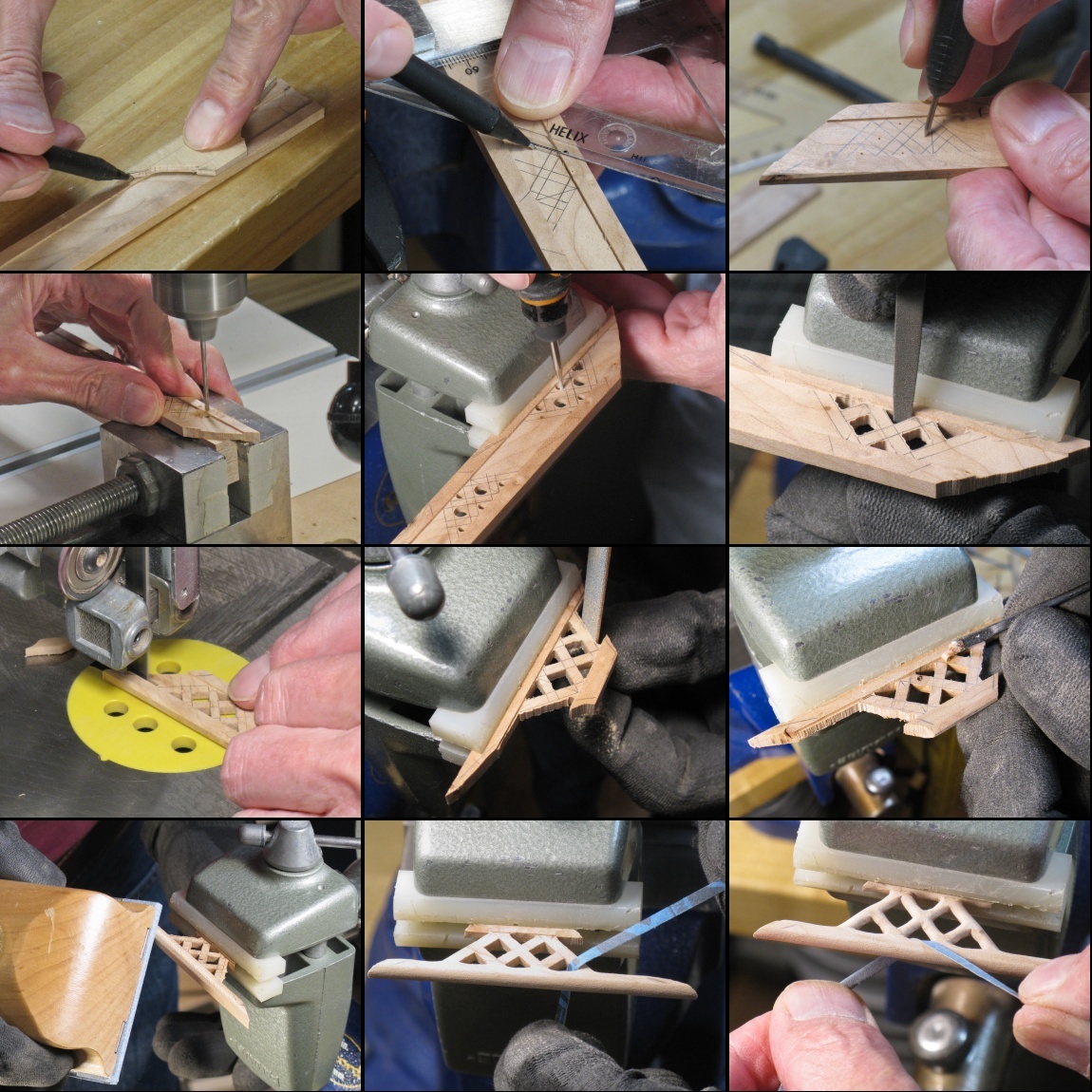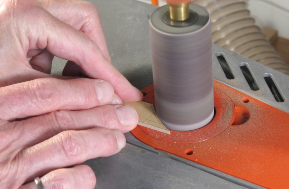 To make the pattern I cut out the proper width on the marked plywood and then cut the ends a bit long. Those ends were incrementally trimmed using the spindle sander while checking the fit between adjustments.
