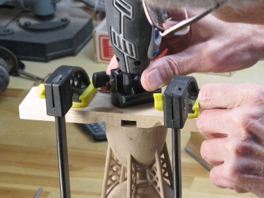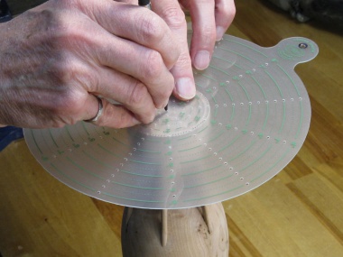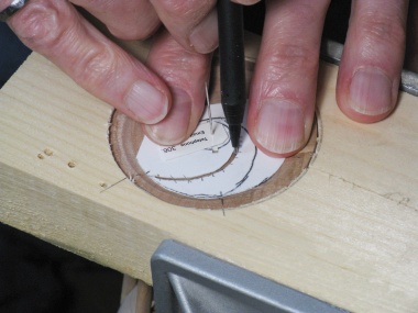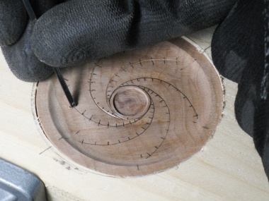 The only remaining woodworking was to add the initial circle to the bottom. I had decided to place it in the center of a inscribed pattern so I took some care finding the center and properly aligning the circle pattern used to guide the Dremel cutter.