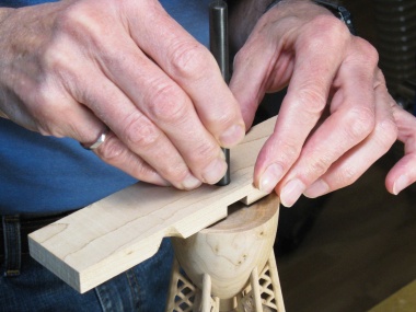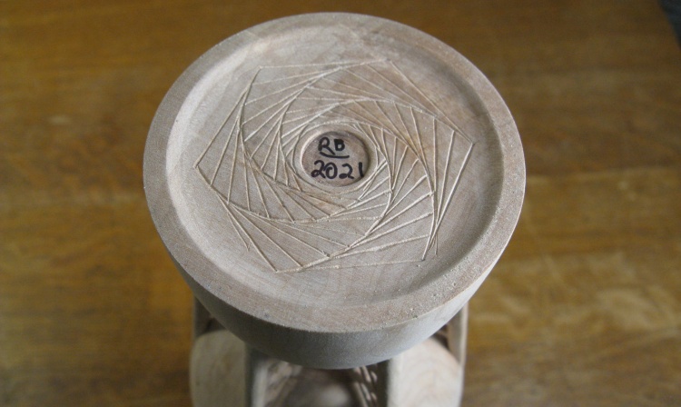 I had made a cardboard pattern that pivoted on a taped-in center pin and used that to draw curves at six evenly-spaced angles around the bottom. The curves were carved first and then I proceeded to the straight lines after first making a little aluminum square to use as a straightedge. All the carving was done with my tiniest V-tool.