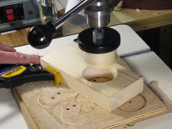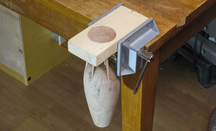 Holding round vessels for carving without marring the finished surface is always a challenge. For this one I decided to make a circular softwood clamp to hold the very bottom. I started with a trimmed 2x4.