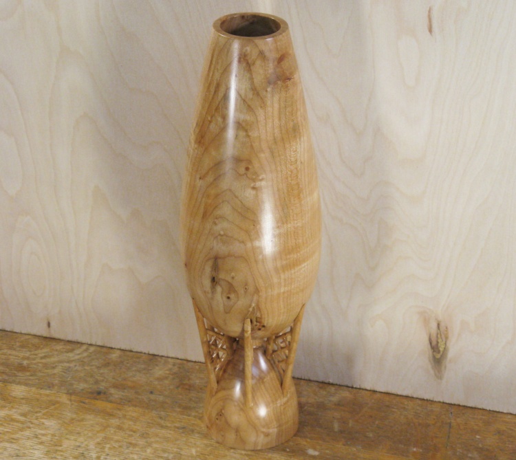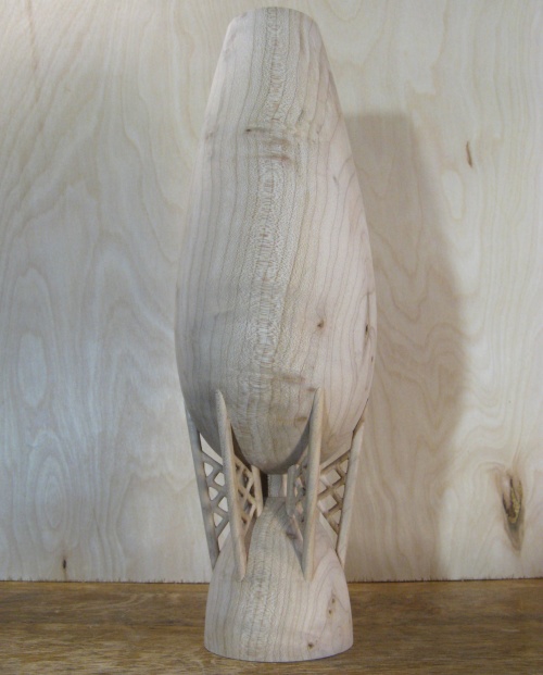 Here the extra bottom wood has been removed, the neck area thinned and reshaped and a foot cut into the bottom.