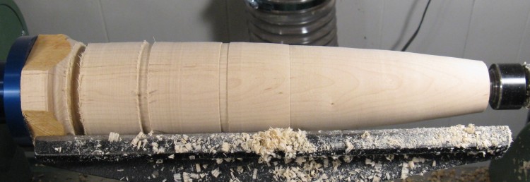 After doing a bit of narrowing at the end, I decided I needed to cut slots to provide depth guides along the length. This was done using a parting tool and measuring the resulting diameter.