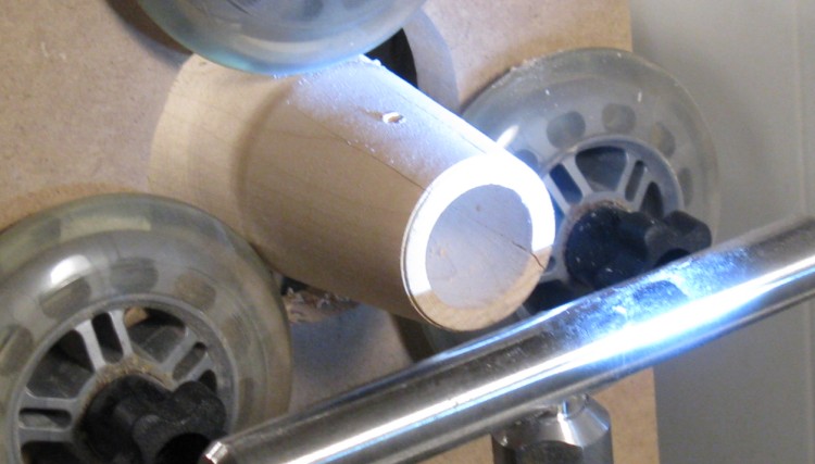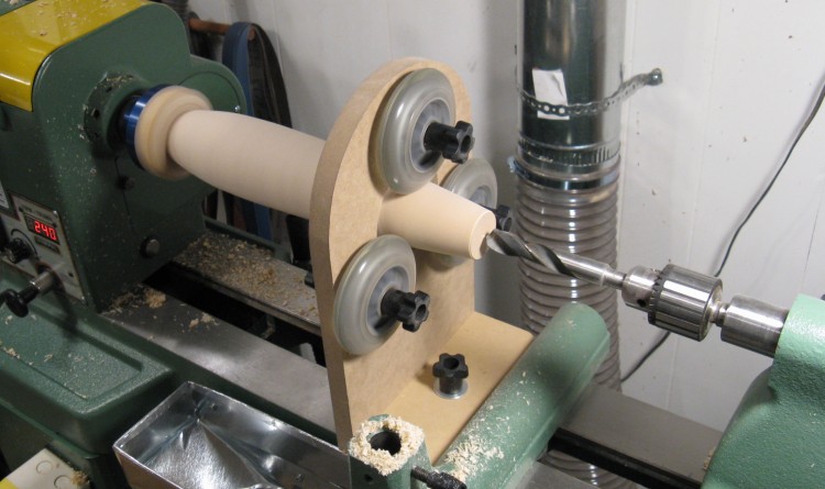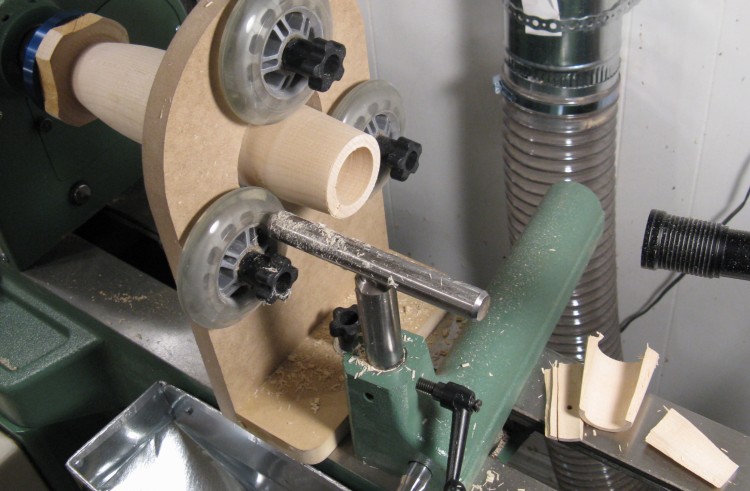The above photo also shows the shop-made "steady rest" used to keep the wood axis steady. With the long length and narrow base of the vessel I was making, it probably would have been risky to try turning without it. The roller-blade wheels are simply adjusted to touch the wood lightly to prevent too much movement. You can see them zinging around in this photo. They compressed the wood a bit where they touched, but that was easily sanded out.