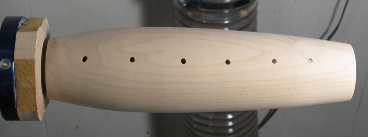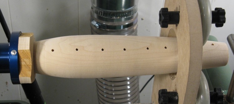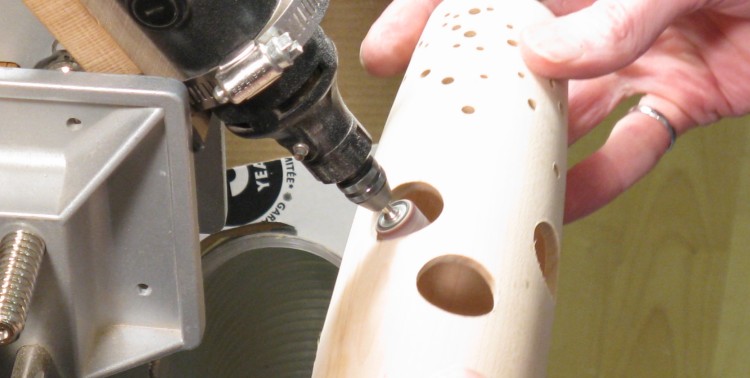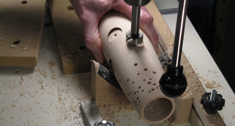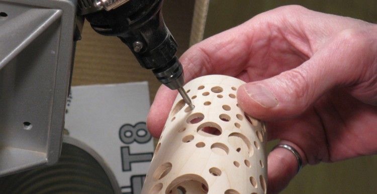 I made a little jig to center the vessel on the drill bit, and then started drilling the smallest holes. While it isn't obvious in this photo, the holes do not go all the way through. Doing so usually resulted in splintering of the wood on the inside. The usual solution to prevent that is to use a backing board tight against the bottom of the wood being drilled. However, with a variable curved inside surface I couldn't think of any good way to do that.