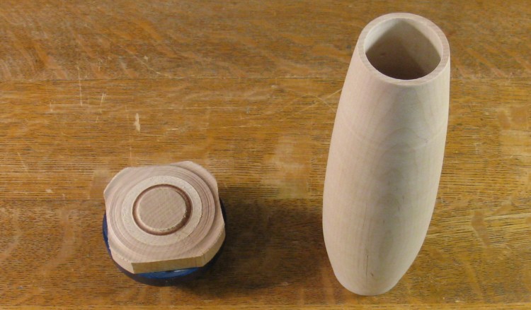 The still-almost-square part of the wood screwed to the faceplate was cut off the vessel as shown here. After sanding the bottom smooth, I belatedly decided that it should probably have a ridge instead.