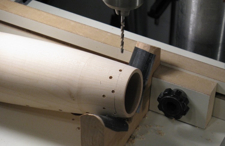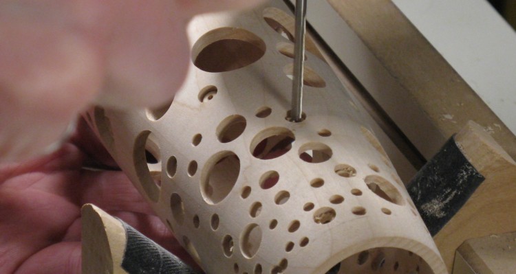The larger holes were drilled with Forstner bits as shown here. For the smaller holes I used brad-point bits where possible, since conventional twist drill bits tend to wander on the curved surface and didn't necessarily make a clean hole.