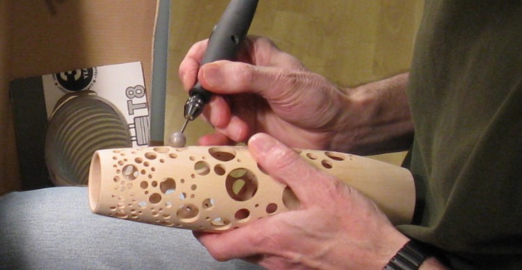 Finally, the edges of the holes were touched up so they weren't quite as sharp. I used variously-sized spherical abrasive bits, oversized to do the outside of the holes as shown here, and undersized to reach in and do the interior edges.