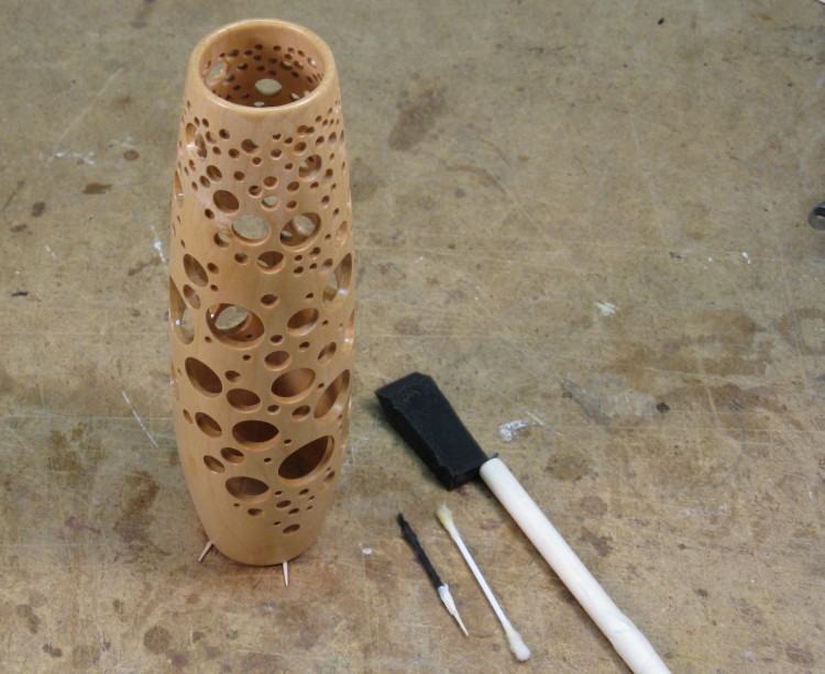 And here the first coat of varnish has been applied. I made a little sponge-wrapped toothpick for coating the smaller holes and used a Q-tip for mid-sized ones (which was a bad idea - it left cotton fibers behind). I also made an extended foam brush for the inside. I didn't happen to have any smaller brushes, so I used a 2" brush cut in half to fit into the vessel - hence the odd offset look.
