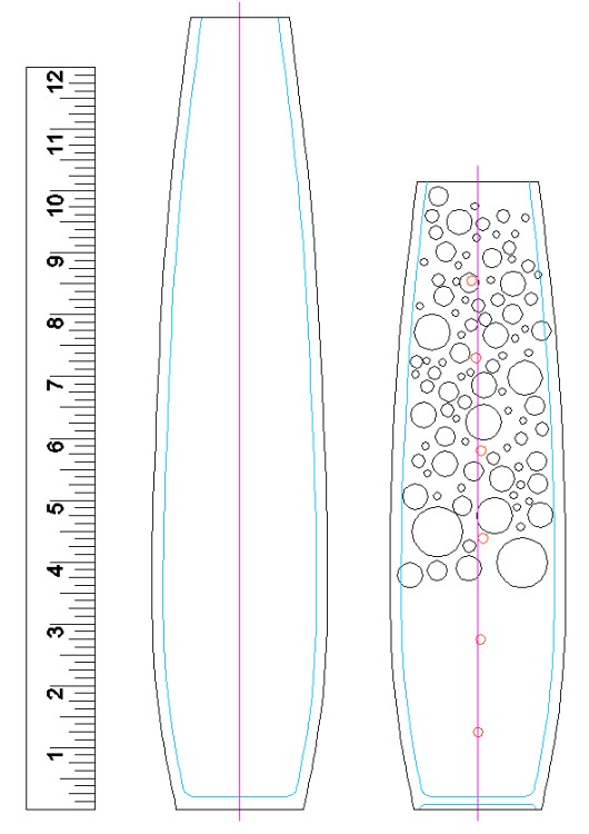 I had a few 3-inch-square blocks of maple that I had picked up on spec a few years ago (they were just a buck a block which seemed like too good a deal to pass up). I selected one of the longer ones which gave me about an inch on the bottom for mounting screws and 13" for the main vessel. I planned the design based on that length, like the left shape in the plan above.