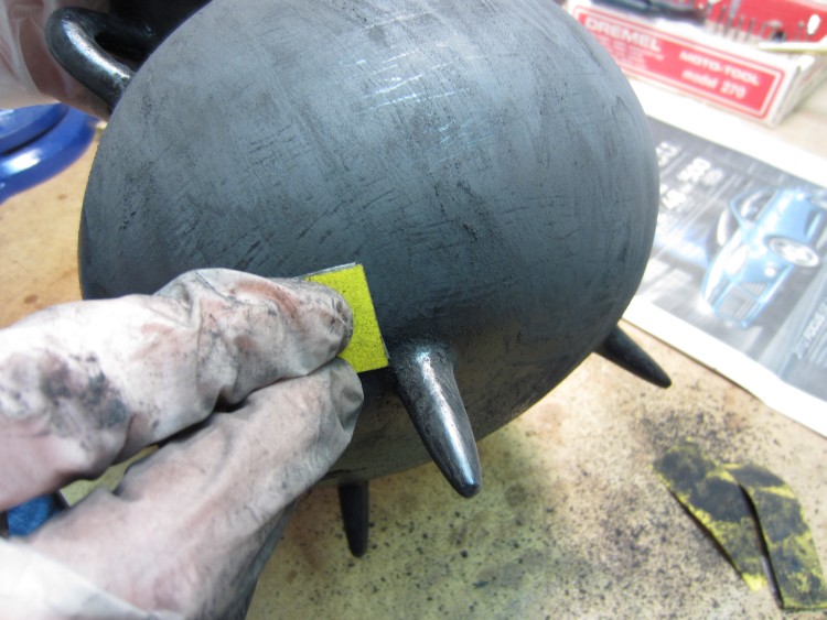 At any rate I decided to start by putting a couple coats on the cauldron with a brush. And lo and behold, that created lots of huge great brushmark texture. I didn't see any way to hide that texture, so I ended up sanding the paint smooth which is (finally) what the picture shows.