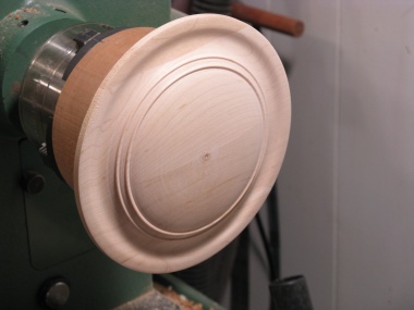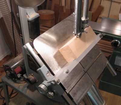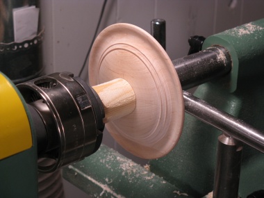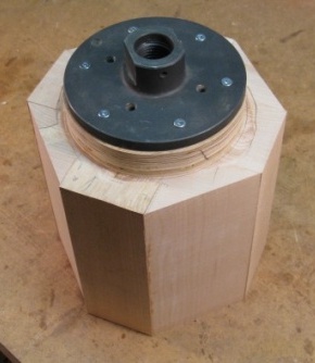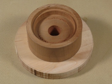 I glued a plywood spacer to the bottom of the blank to provide a means to screw on the 6" mounting plate. That way, the screws don't extend into the blank, and its full length can be used for the piece. It turned out that the length was more than I needed, so the spacer was completely superfluous, but at least it gave me the opportunity to use "superfluous" in a sentence.
