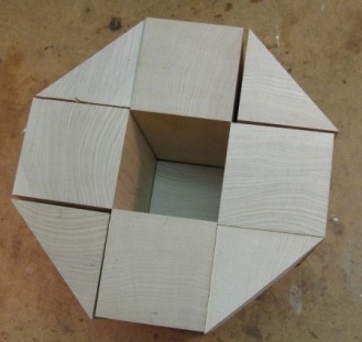 Cutting up the two pieces of wood resulted in the six short pieces shown here. However, since I needed nine pieces to make the blank, I cut two of the pieces in half diagonally to go in the corner positions. This actually reduced by a bit the available diameter that could be turned from the blank, but it was still large enough.