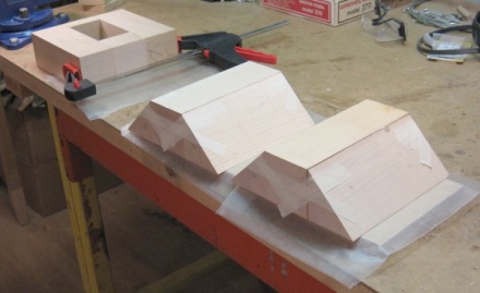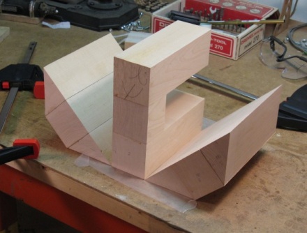 This shot shows a test fit of the eight wall pieces and the one short floor piece. For a more manageable glue-up, I made three 3-piece sections separately. Trying to clamp a form with 45 degree angles turns out to be surprisingly difficult. Since building some kind of custom clamping jig wasn't in the cards, I just used masking tape pulled tight. The rectangular group on the end with the actual clamp has an extra spacer where the opening for the cauldron will be. This wasn't glued in - it was used only to keep the pieces square.
