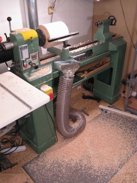 The dust collection system (connected to the big flexible hose and metal opening) should pull out most of the fine dust generated by the turning, but doesn't do much for larger chips shooting up from the lathe. I suppose that if I wanted to try to collect all the chips, it would probably take a complete hood covering the workpiece. Instead, I just shake the wood chips out of my hair and vacuum up after messy operations.