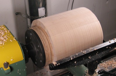 The first step was to round the blank to a cylinder, which gave a good starting point for getting to the final shape, but also helped with the balance (since if the blank is not perfectly centered and symmetrical - and it wasn't - then it can create a lot of vibration as it spins). The shot here shows the roughing-down about half done.