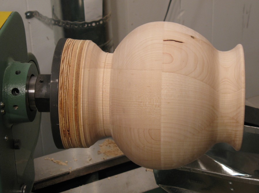 This shot shows the profile of the cauldron after shaping was complete. Unfortunately, I made a bit of a gouge in the wood when shaping the middle-to-neck portion, and I had to cut away more material than I wanted in order to smooth it out. The end result was this shape.