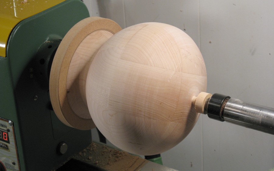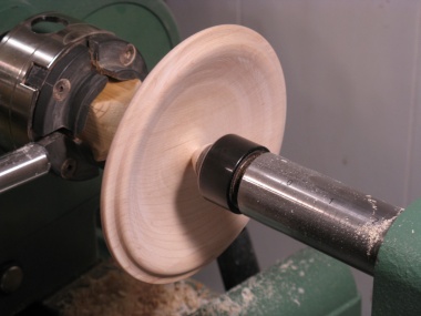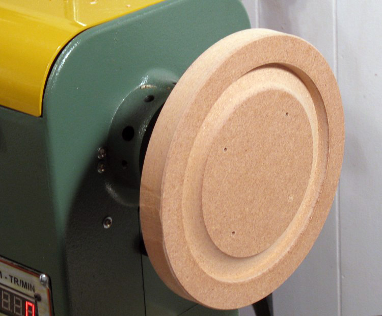 To hold the neck of the cauldron, I modified a previously-used MDF disc to make the jam chuck shown here. The cauldron was then held between that chuck and a live center as can be seen below.