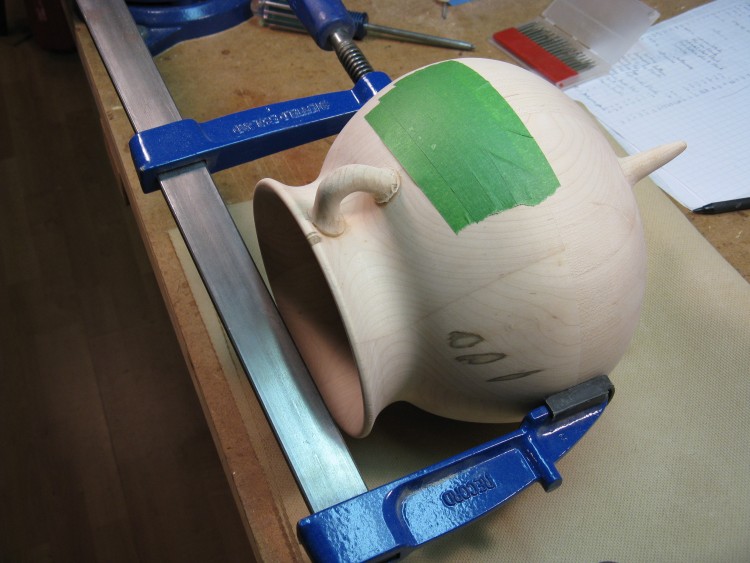 This shows the makeshift clamping arrangement used to hold the vessel in place for sanding the handle flanges. The green masking tape is a bit of a shield for the side of the vessel to reduce damage from any errant filing.