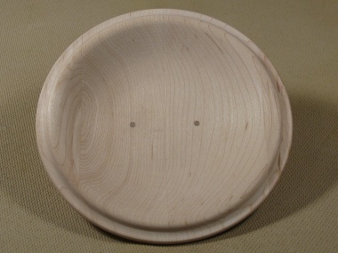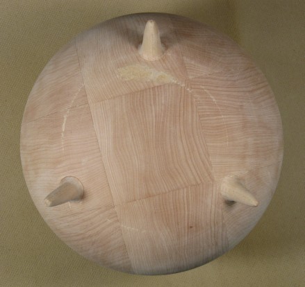 The above photo shows the bottom after the "turning knob" was removed. Also visible on the far side as a lighter-coloured patch is the gouge mentioned earlier. Here it has been filled with a mixture of glue and sawdust from the turning, and then sanded to the same contour as the body. After painting, this should be invisible. The same goes for the darker spots apparent on the main body photo. There's certainly something to be said for being able to paint over defects, blemishes and goofs. Making the blanks and the turning took around 17 hours - less than half the total time.