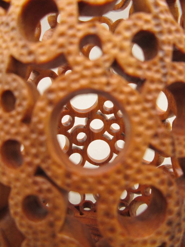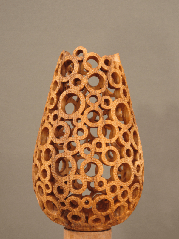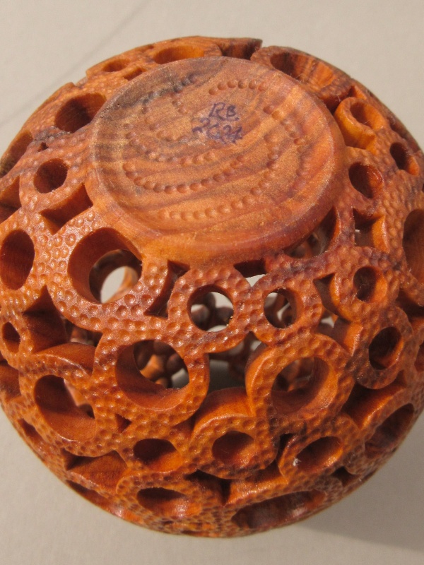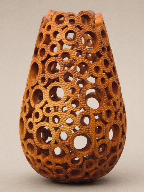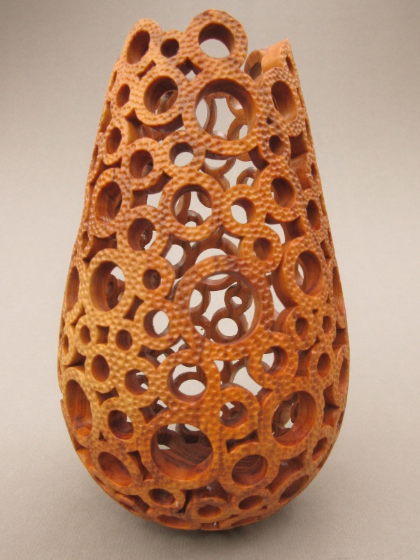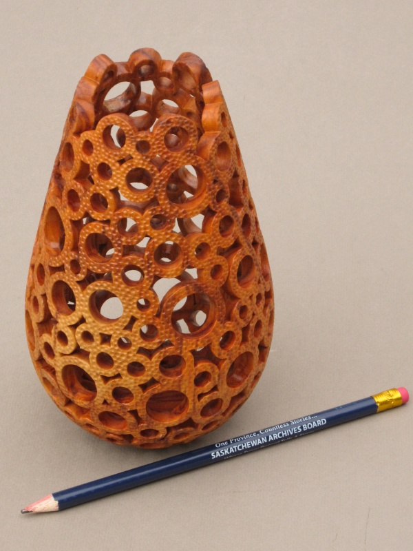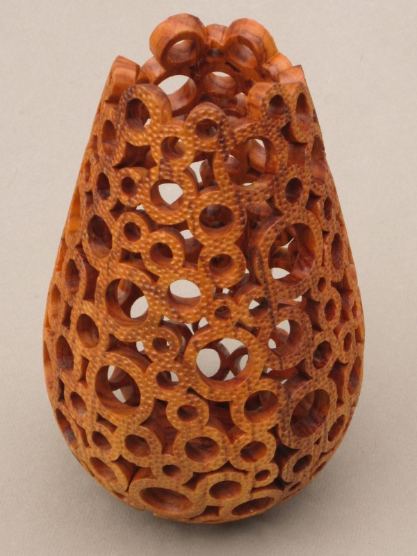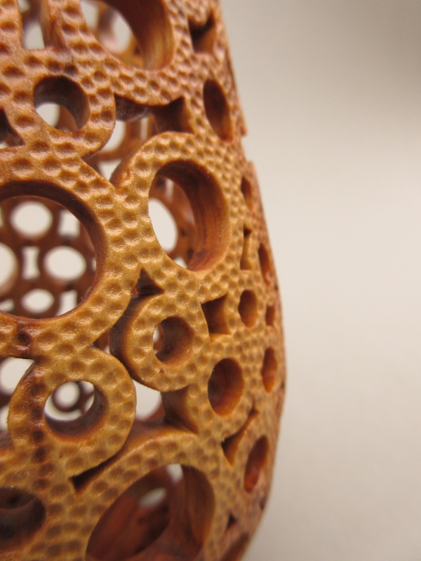 formed from a hollowed turning which was then selectively pierced and then textured. The process was straightforward; a drill and rotary tool were used to form the round holes with a small jigsaw followed by needle files for the un-round holes. Finally a small grinder was used for the texture.