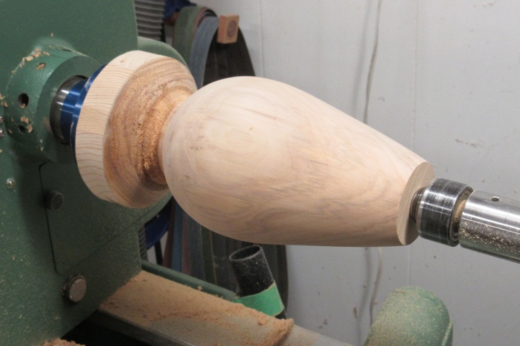 I chopped off the more egregious corners of the oddly-shaped block and then put it on the lathe and turned it in my usual manner to get to the shape shown here.