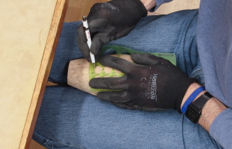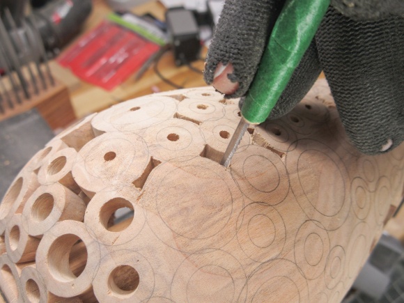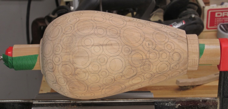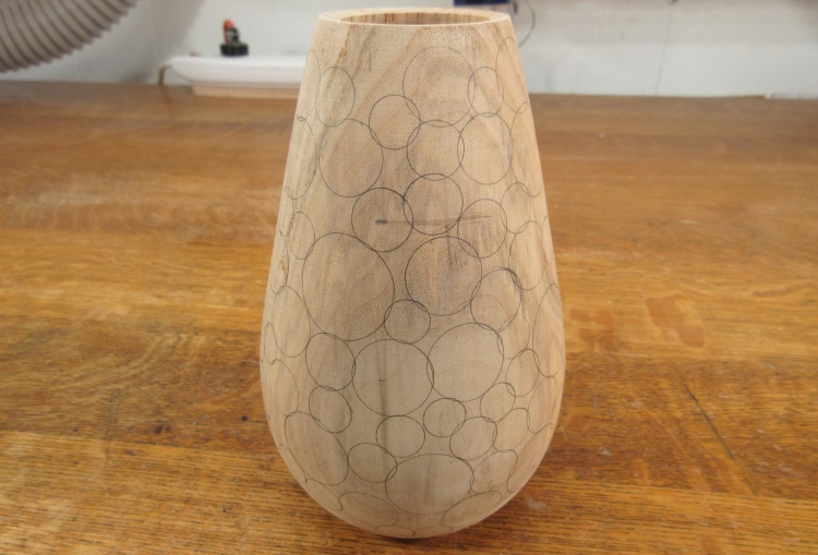 With the turning done, I started pencilling in the outlines of the donuts with the aid of a circle template.
