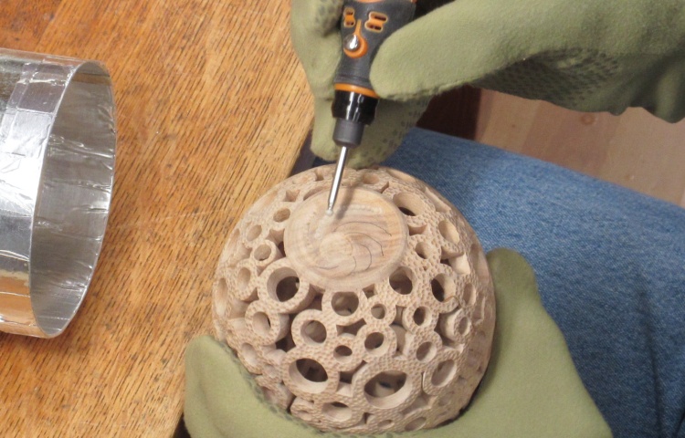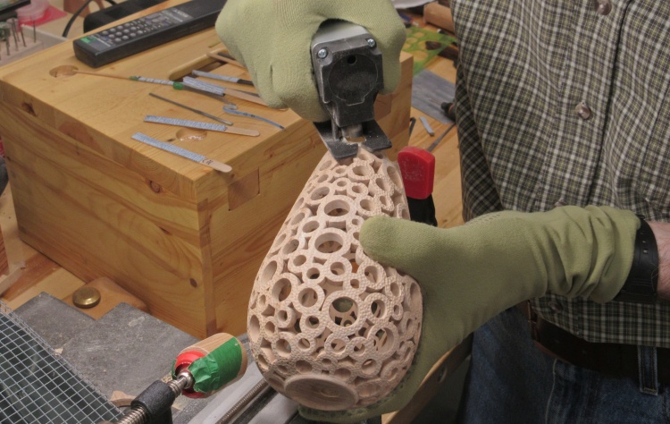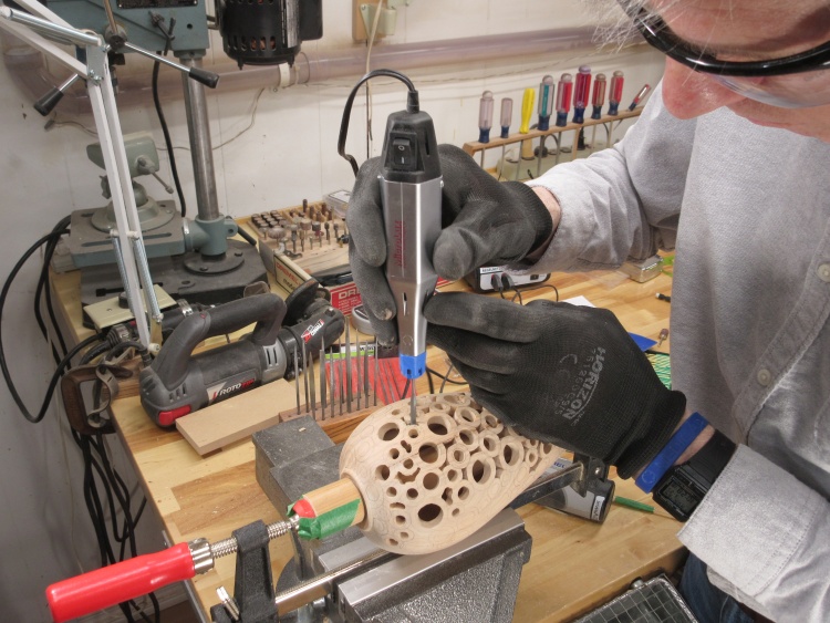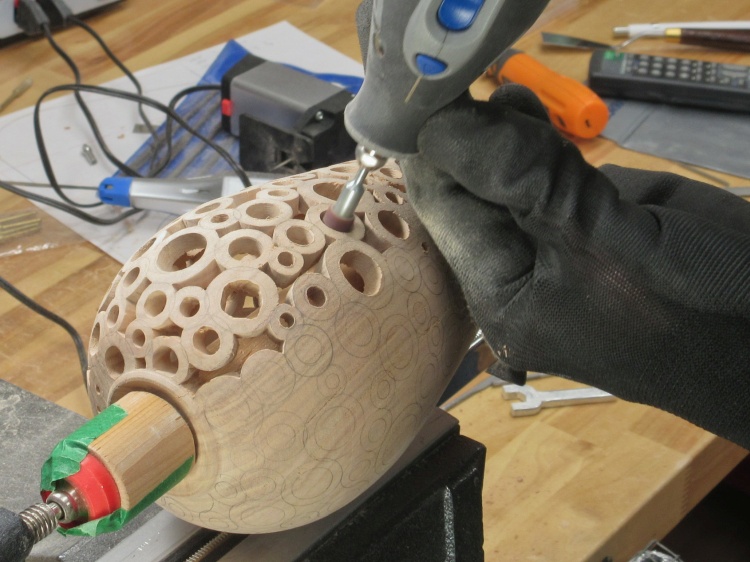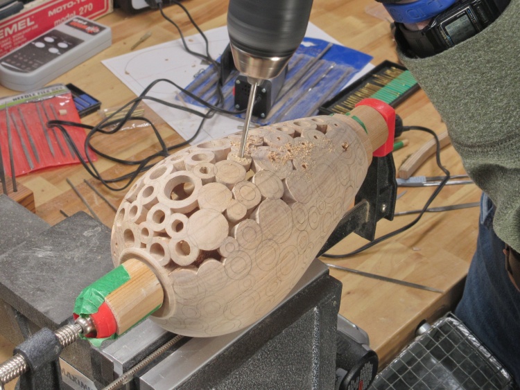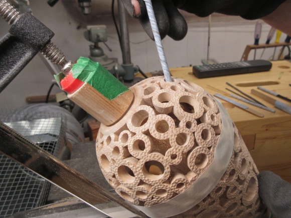 To do the piercing, the vessel was going to need to be held securely. I used my normal technique of clamping the bottom via a pair of dowels. A wood ring sized to fit tightly into the mouth of the vessel slides over the long dowel to keep the vessel centered.