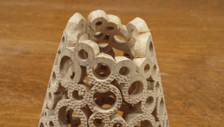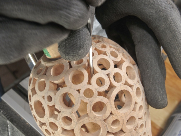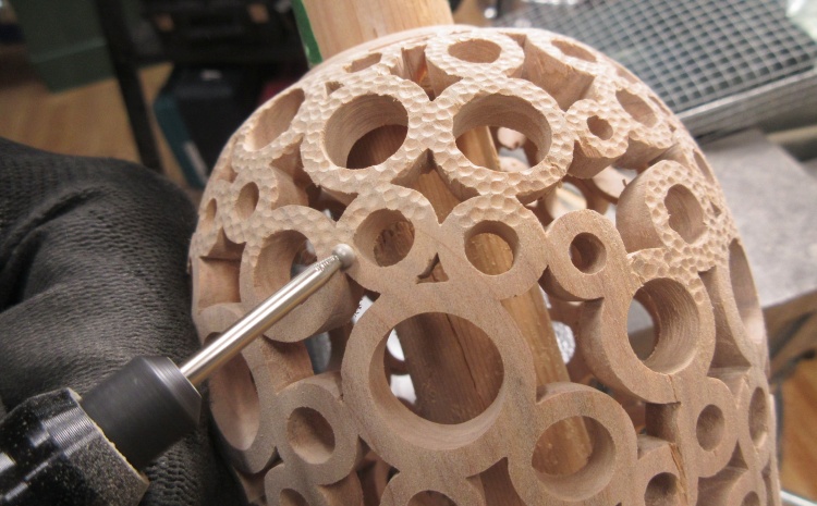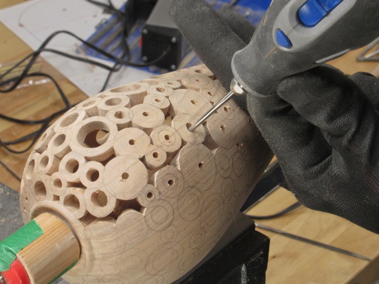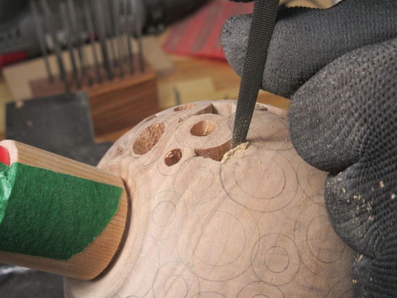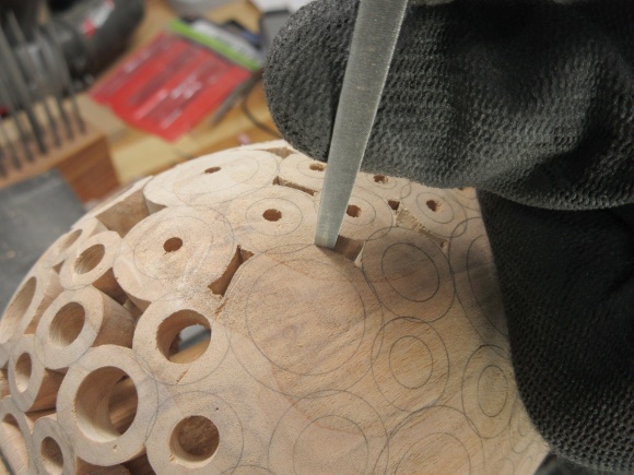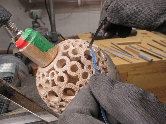 At this point the texture is on everything but the top donuts of the vessel. I also wanted to de-burr and dull the sometimes-sharp corners in the pattern. For the between-donut areas, I used a narrow strip of sandpaper attached to the end of a thin bar while the hole insides were treated using a sandpaper-equipped dowel.
