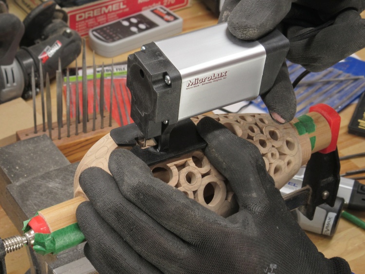 The next step was to enlarge the donut holes until they were just a bit undersized. This was done with a spiral bit held in a Dremel rotary tool as seen here.