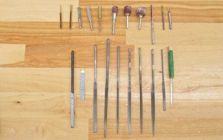 This unrealistically orderly arrangement shows the bulk of the bits and tools I used to form the openings on the vessel.