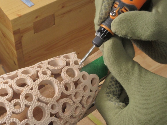 It wasn't really practical to wipe out each sharp-cornered hole so I used the central vac with a cloth filter to pull out any excess finish from the openings.
