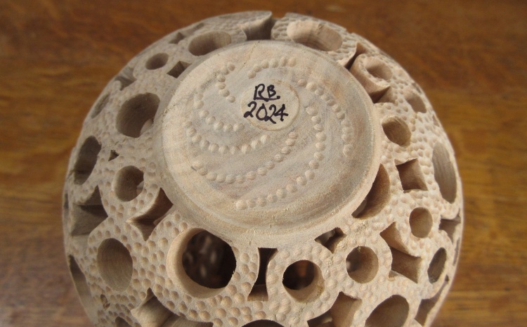 This vessel uses the last bit of a couple old spruce logs I had picked up from someone through Kijiji in 2020 when I needed a largish piece of wood on which to check some carving techniques. It's been sitting around the shop and quietly muttering "you could make something out of me" every time I went by. I had originally planned to made a different style of vessel but some testing showed that the Spruce was going to be too soft for that one, so I was forced to "pivot" as they like to say these days. I had already turned and hollowed the vessel by this point so I "popped the stack" on vessel designs and used the next appropriate one; the donut vessel.