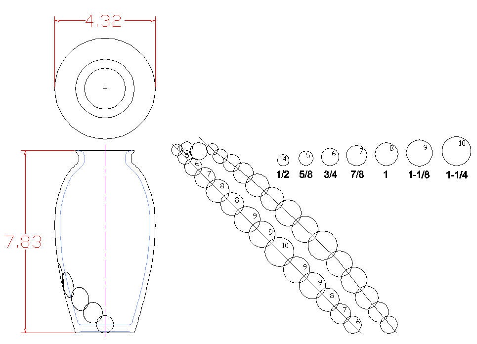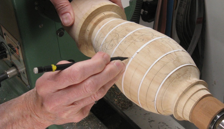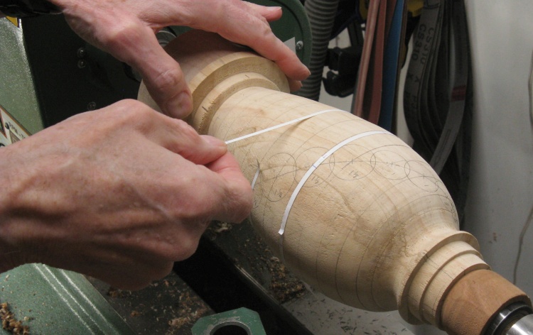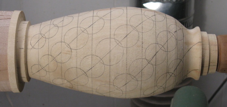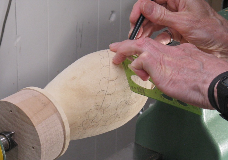 After making a small selection of logs, I thought I'd better determine how many of each size were going to be needed. That meant (figuratively) nailing down the pattern on the vessel. I puttered around on the blank, drawing and erasing patterns until I got one I liked.