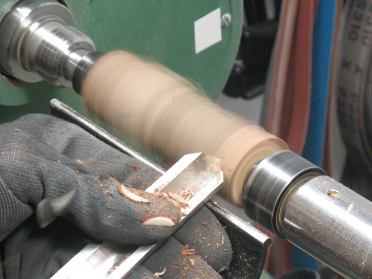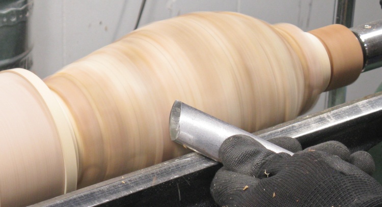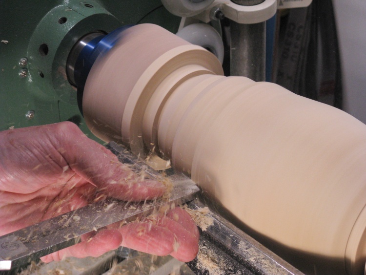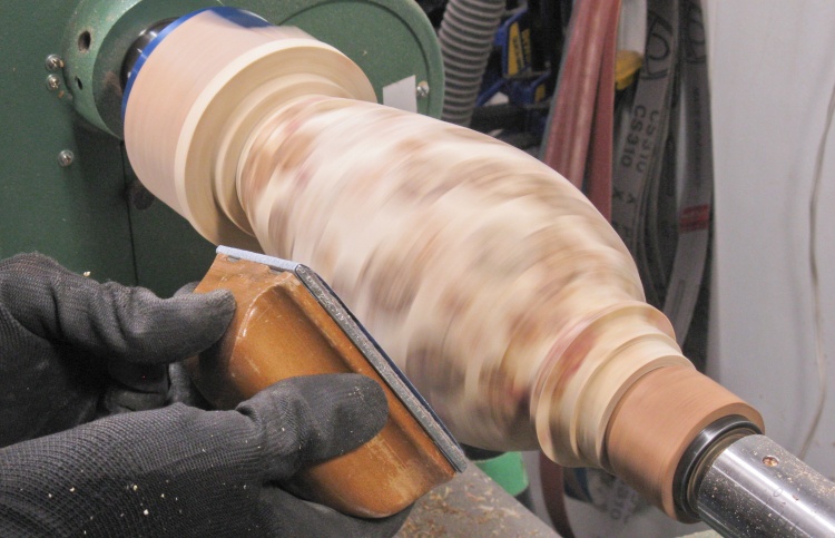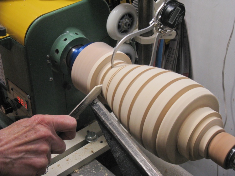 The branch pieces were rounded to one of a few specific diameters. I started with the roughing gouge as seen here and usually followed that with a scraper.