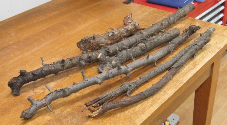The vessel would need logs between 1/2" and 1-1/4" diameter so I gathered a few branches of appropriate size. This group is all from backyard trees.
