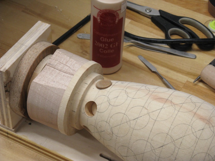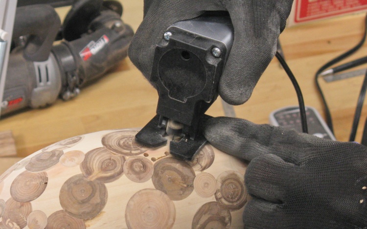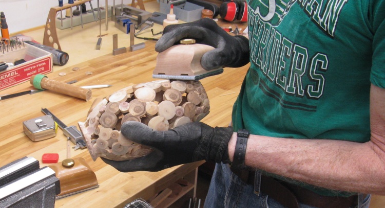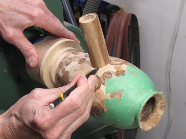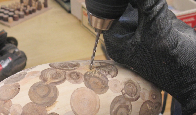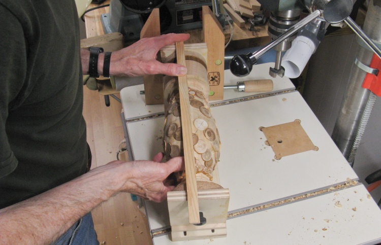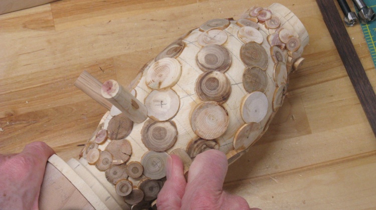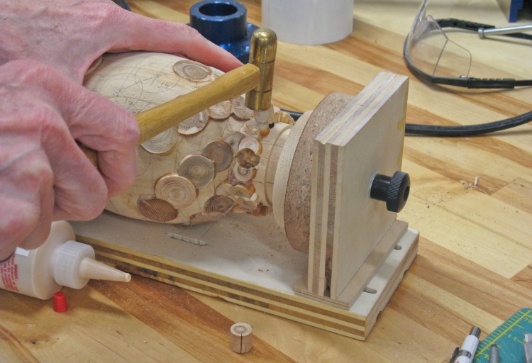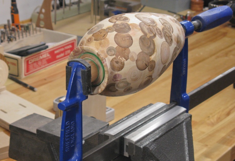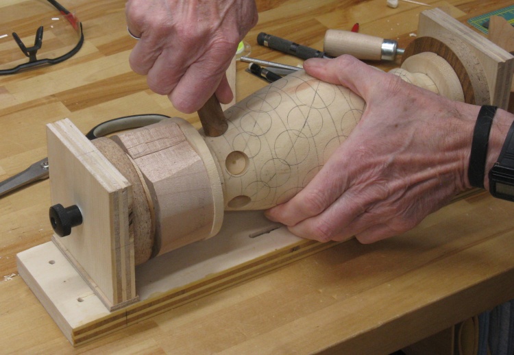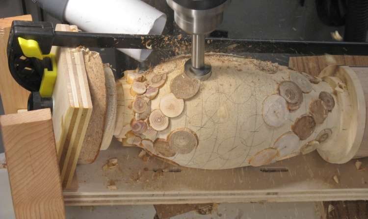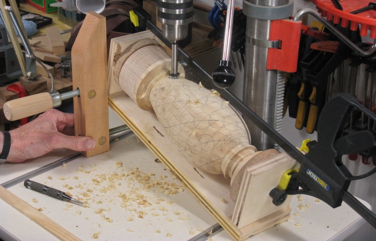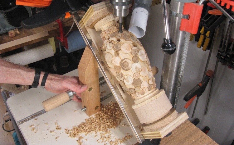 The vessel blank was mounted in a plywood jig that held the ends and let it rotate. I needed the holes to be drilled perpendicular to the surface so I used a large wooden hand-screw clamp to hold the jig at the proper vertical angle for each row of holes.