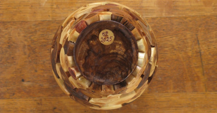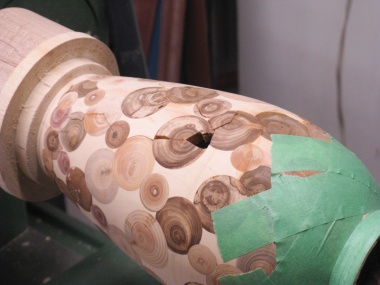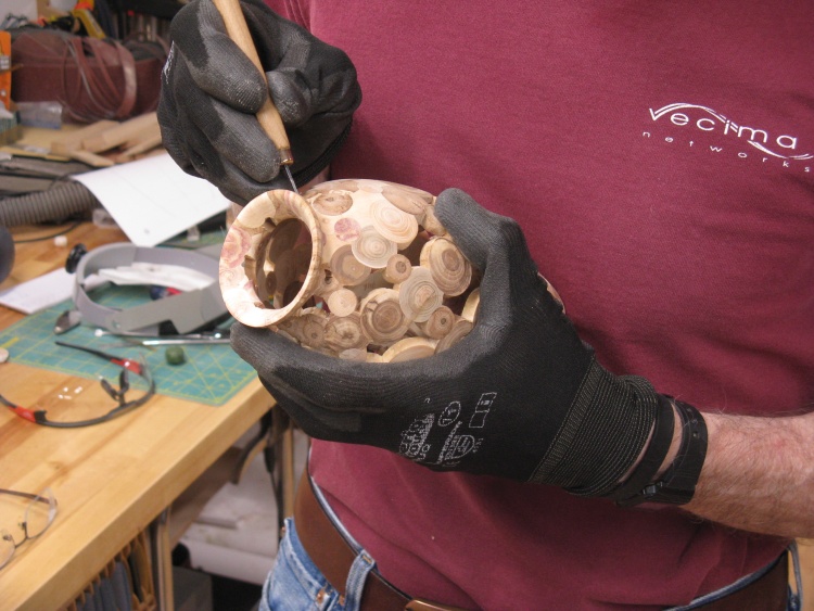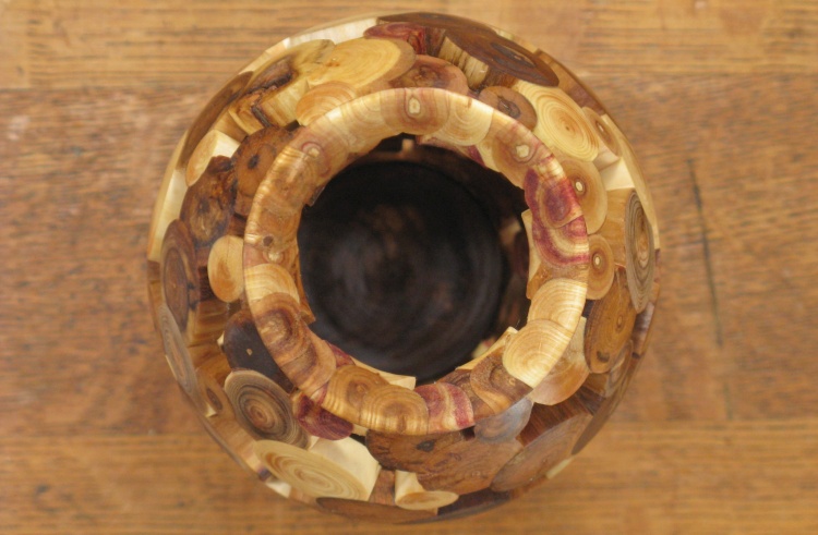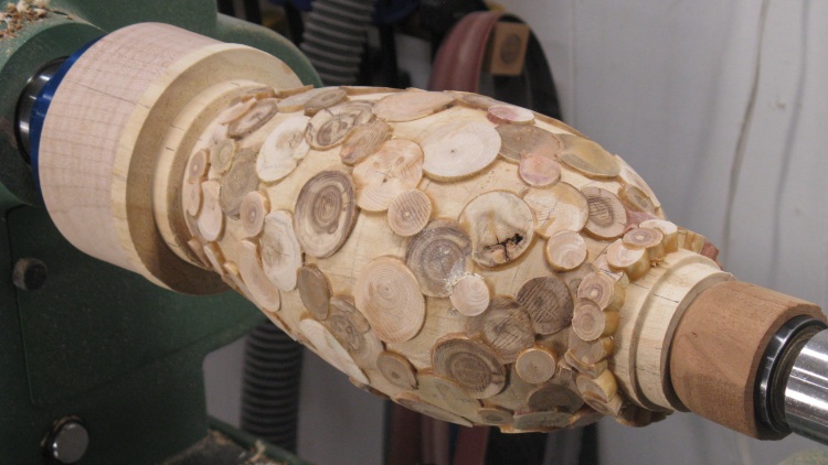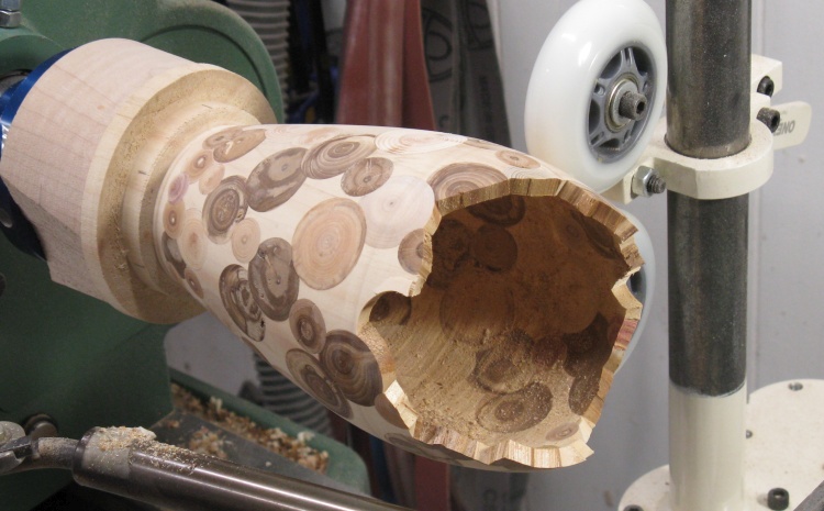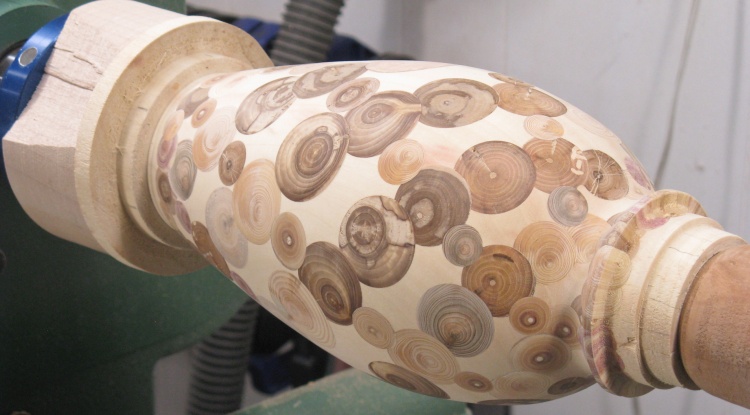 plug coasters) or leave some gaps. I opted for gaps. Of course this wouldn't be my first "leaky vessel" so I wasn't too concerned about that. To make it practical to actually fabricate I started with a solid vessel and embedded the end-grain pieces so everything was solid before it was rounded and then hollowed on the lathe. Of course then any still-present bits of the original vessel needed to be removed; which is the answer to the question: "How did you spend your summer?".